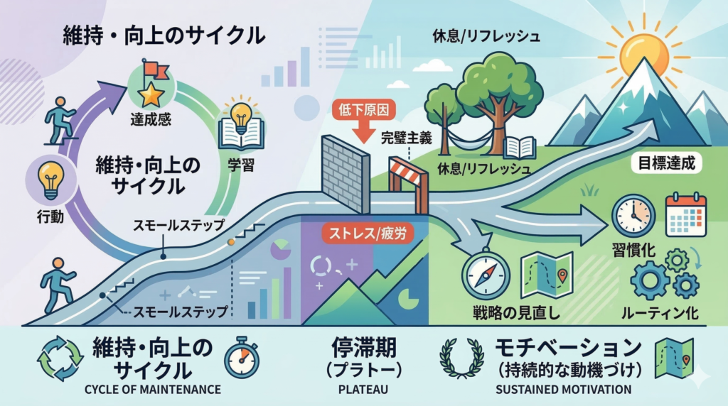 ・焦らず休息を取り入れつつ新たな刺激やアプローチの変化を加えることで停滞期を脱却できる